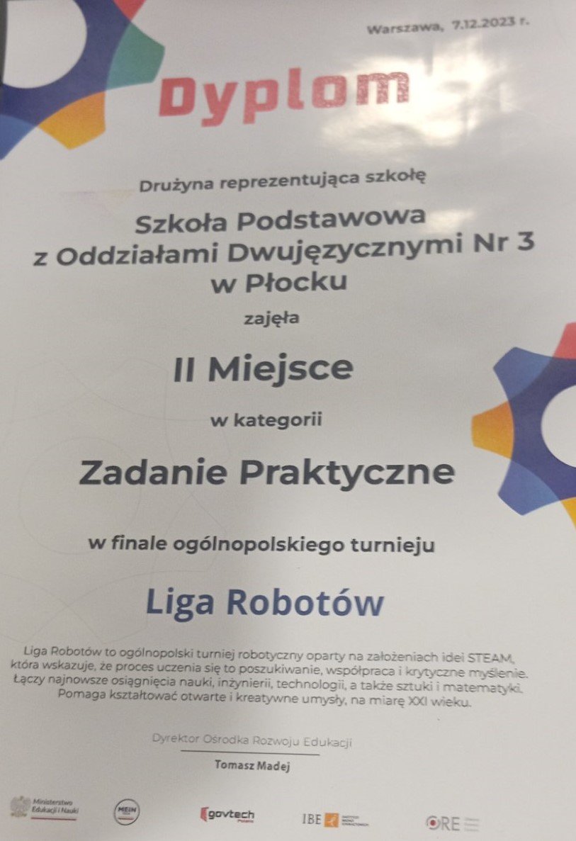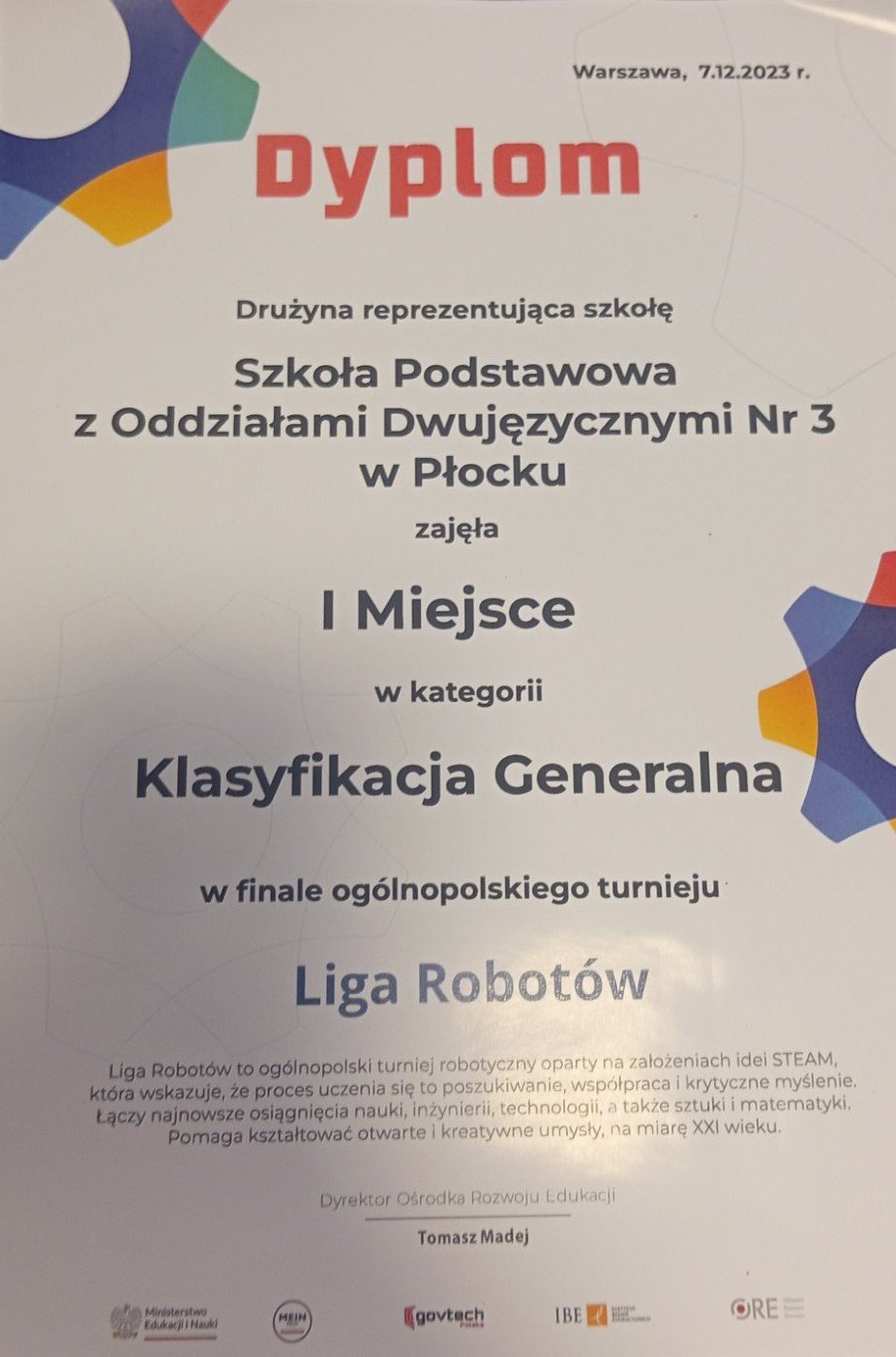Ostatecznie, dzięki wysokiej i przede wszystkim równej dyspozycji we wszystkich konkurencjach, drużyna naszej szkoły zdobyła nieoficjalne Mistrzostwo Polski w zawodach robotycznych Ligi Robotów 2023, wygrywając klasyfikację generalną zawodów. Dodatkowo, chłopcy wywalczyli 2 miejsce w konkurencji przejazdu praktycznego robota.