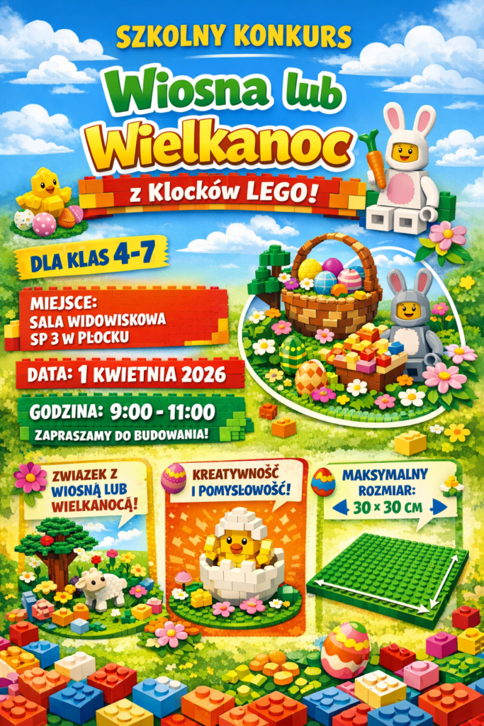 Zapraszamy uczniów klas 4–7 do udziału w szkolnym konkursie LEGO, który odbędzie się 1 kwietnia 2026 r. w sali widowiskowej Szkoły Podstawowej nr 3 w Płocku.