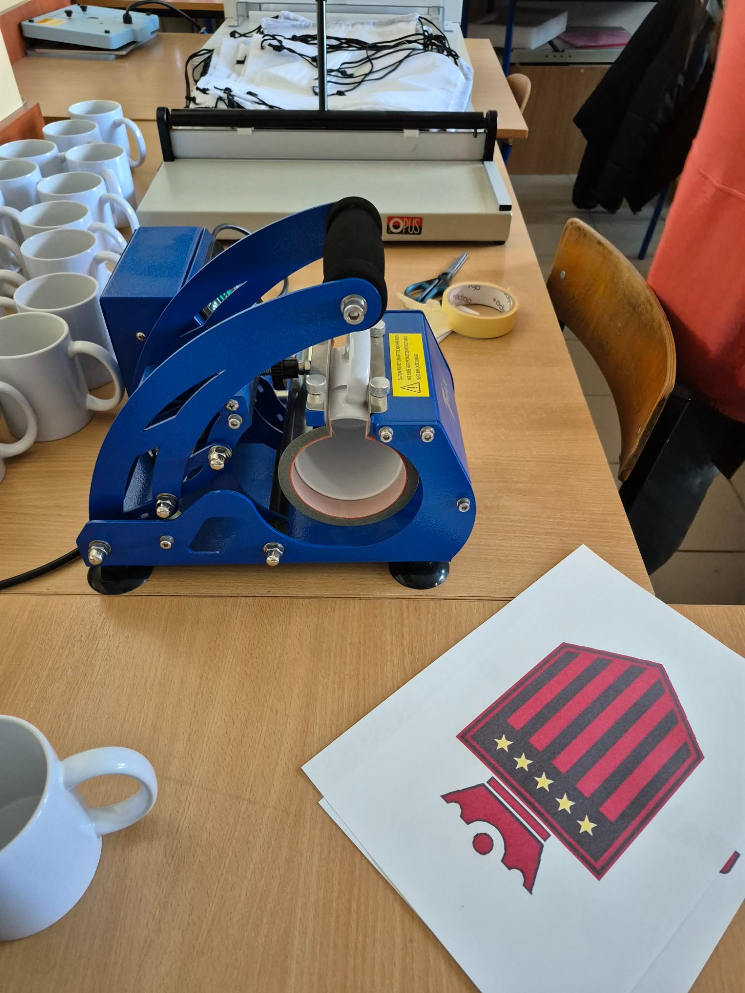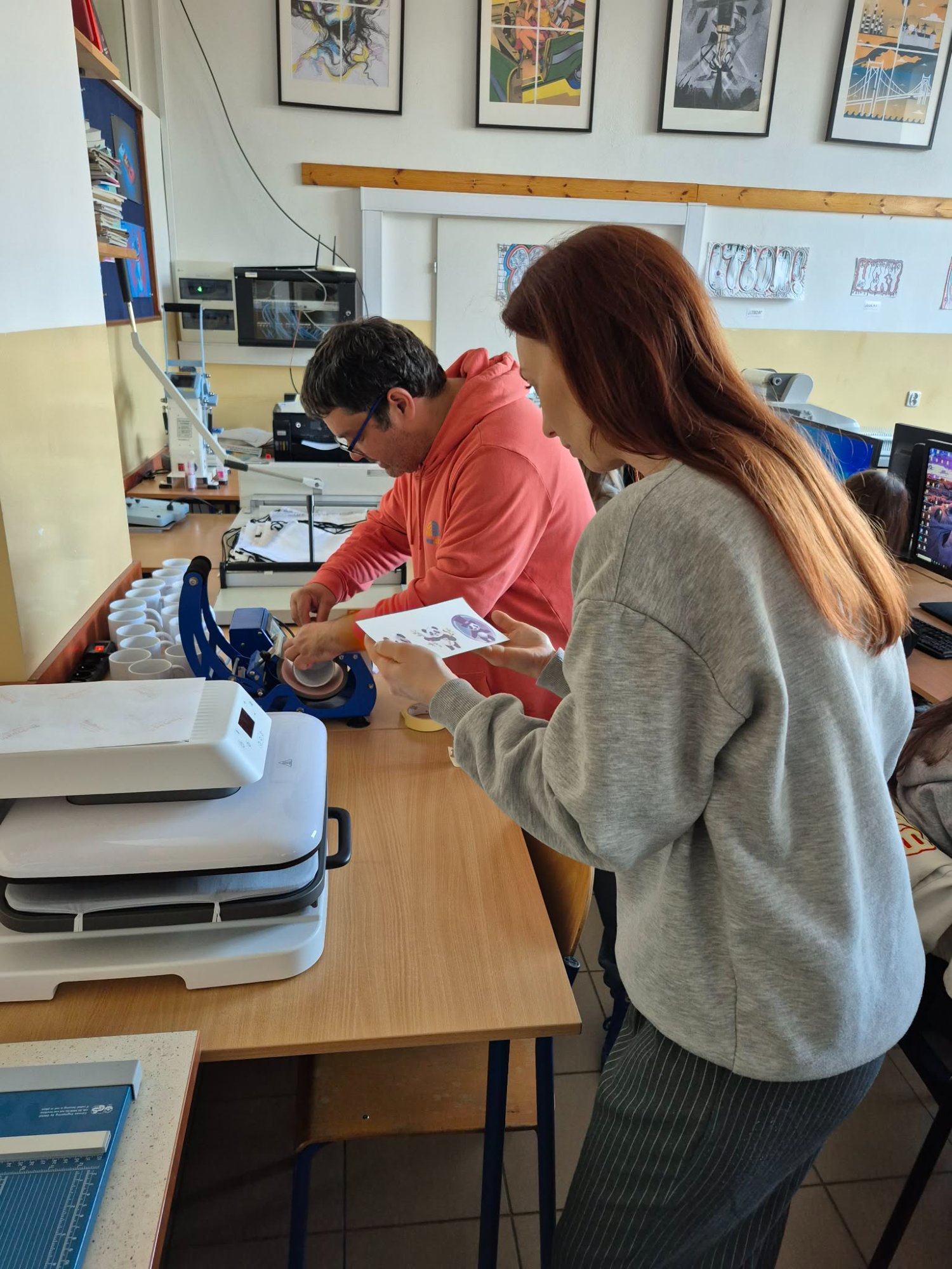 Podczas spotkania uczniowie wykonali nadruki na kubkach i workach sportowych. Zajęcia odbyły się w ramach doradztwa zawodowego, a opiekę nad klasą pełnili pani Renata Pawlak i doradca zawodowy, pan Paweł Śmigała.